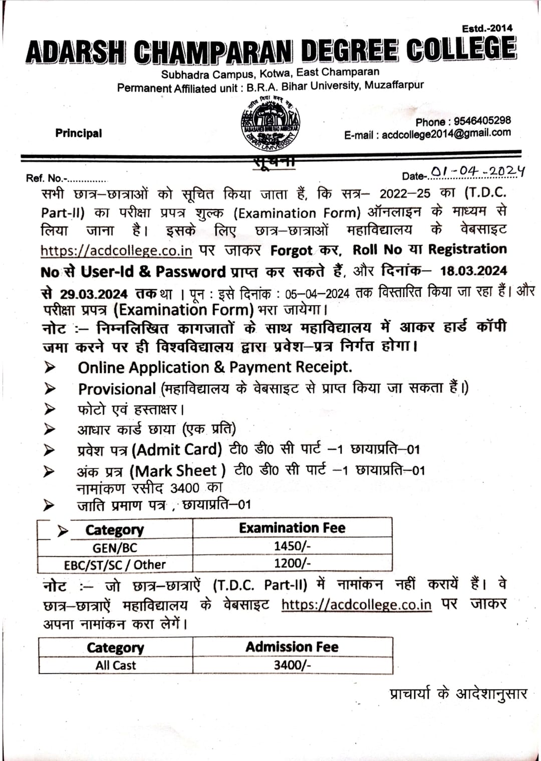 Transaction fee charges would not be refunded/ reversed under any circumstances for any refund/ reversal /chargeback and any other reasons.Transaction fees charged would be borne by cardholder for any payment.. Fees once paid which are non-refundable for any reason or any clause of ADARSH CHAMPARAN DEGREE COLLEGE,KOTWA.. T&C, privacy policy & contact us details are need to be update on website.