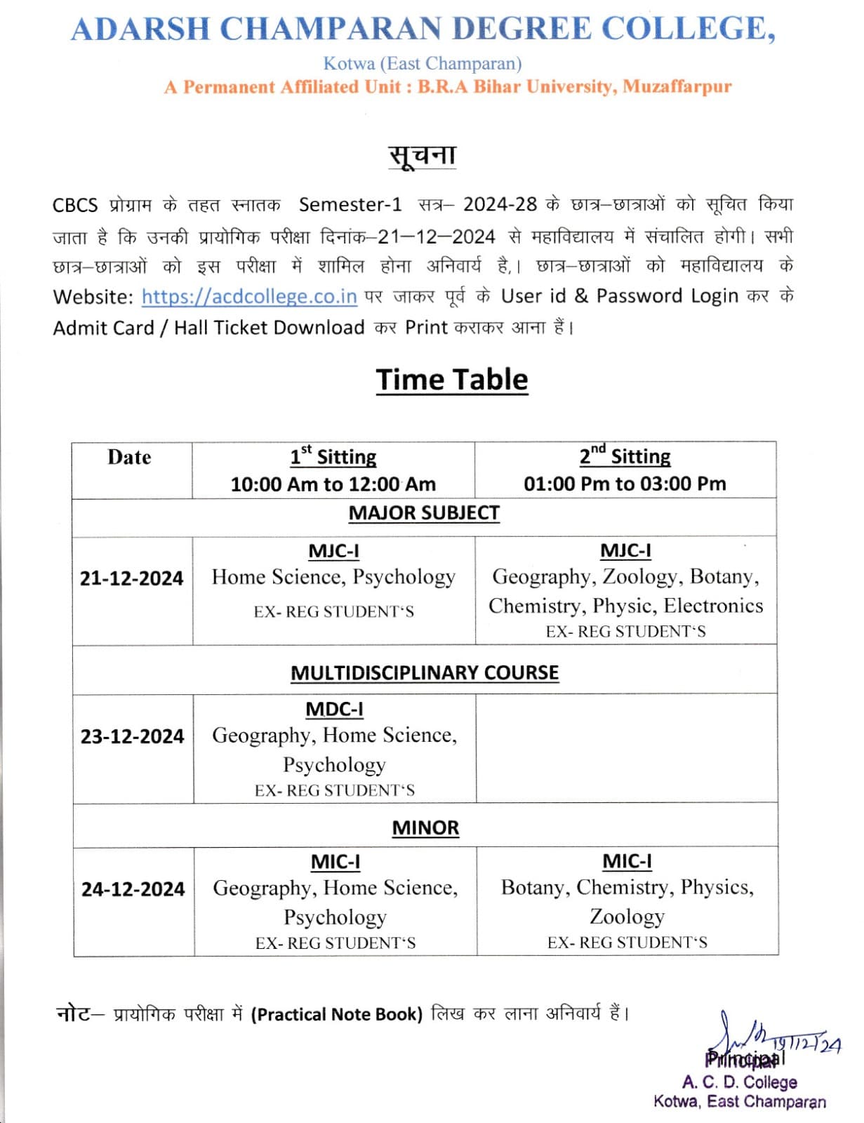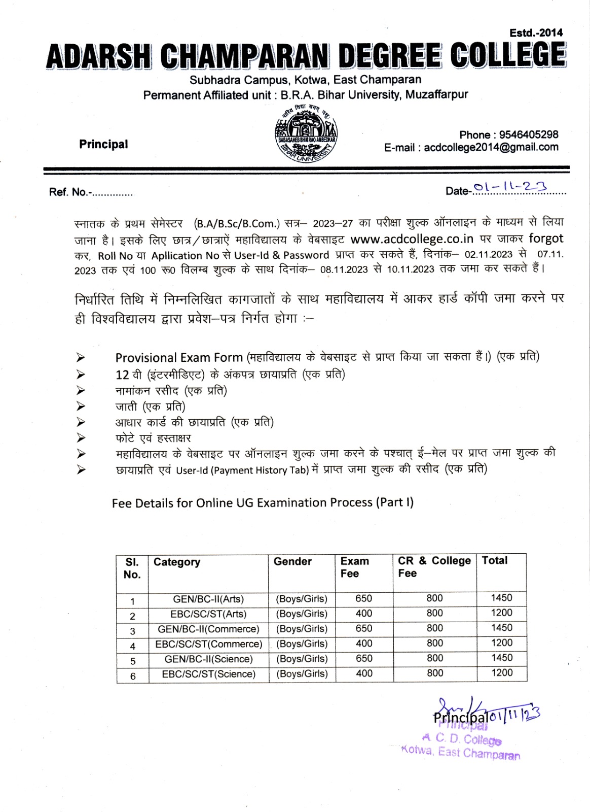 'Admission Notice Semester-I 2025-2029 2nd Merit'ADARSH CHAMPARAN DEGREE COLLEGE, KOTWA is located in Kotwa, heart of East Champaran a district in Tirhut Commisionary.This college is permanently Affiliated with Baba Saheb Bhim Rao Ambedkar University, Muzaffarpur, in Arts, Science, Commerce in Bachelor degree. Here is an oppertunity to learn from well qualified and experienced teachers. We have provision for N.S.S. career counselling and Remedial Classes time to time. This college always helping students for their development in all field.