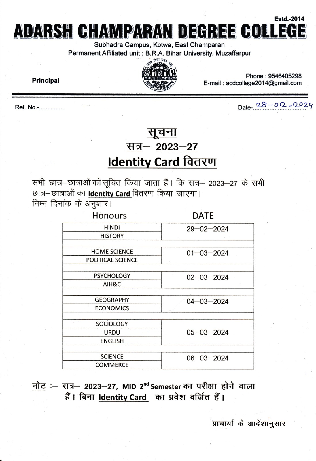 'पहचान पत्र (2023-2027) वितरण के बारे में सूचना। '