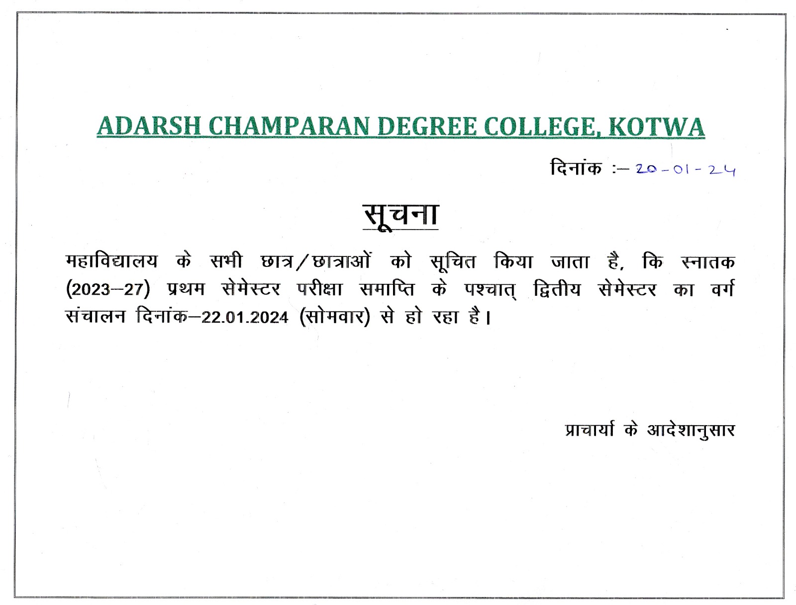 'Admission Notice Semester-I 2025-2029 2nd Merit'ADARSH CHAMPARAN DEGREE COLLEGE, KOTWA is located in Kotwa, heart of East Champaran a district in Tirhut Commisionary.This college is permanently Affiliated with Baba Saheb Bhim Rao Ambedkar University, Muzaffarpur, in Arts, Science, Commerce in Bachelor degree. Here is an oppertunity to learn from well qualified and experienced teachers. We have provision for N.S.S. career counselling and Remedial Classes time to time. This college always helping students for their development in all field.